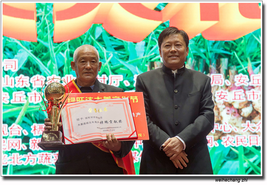 连续五年蝉联绿旺达杯姜王大赛(大拱棚)单产奖项的姜王——刘吉宗,被授予“特别贡献奖”。绿旺达公司董事长周元杰同志为